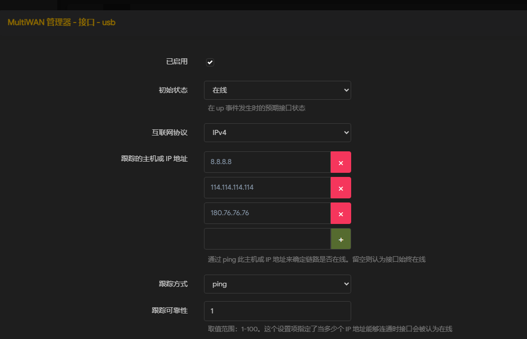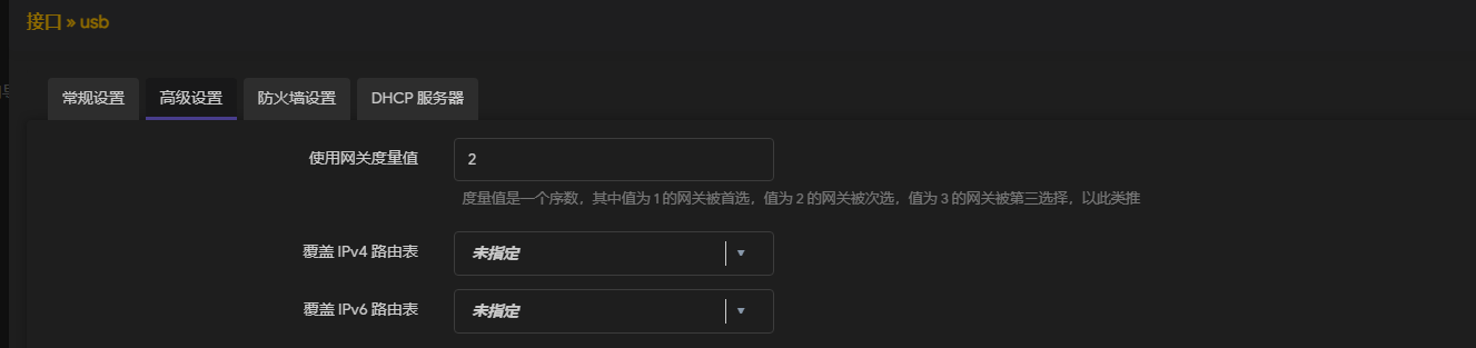 1. 配置接口,给usb网卡,分配网管度量值 2,我这里 wan 是 1