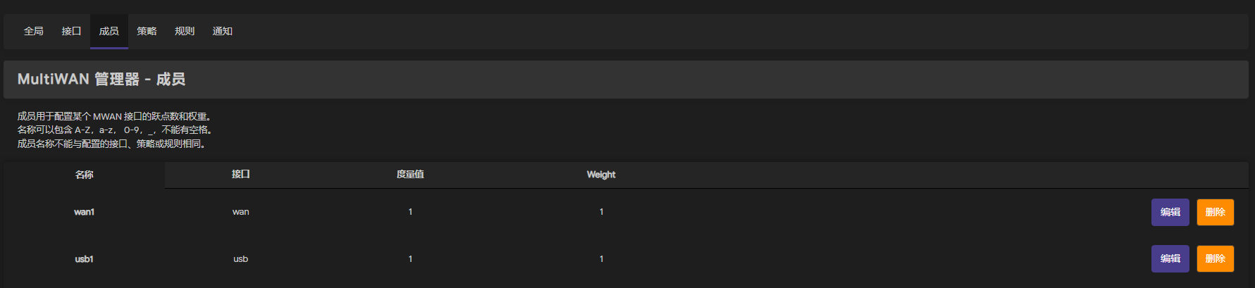 1. 创建成员,度量 权重全都给 1,我这里两个网都是同一个运营商,实现带宽的叠加(似乎没啥用 悲 唯一用处就是 手机套餐每个月不会白费不用)